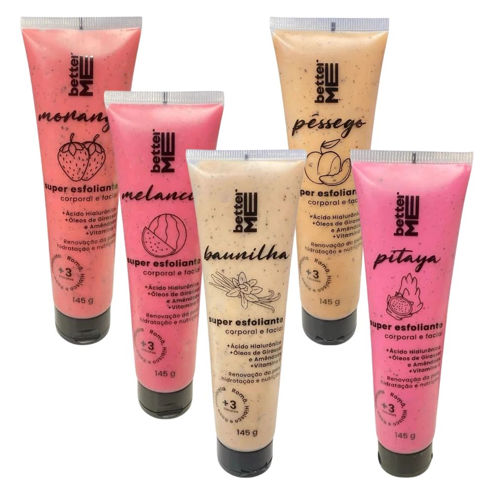 Esfoliante corporal e facial contêm ingredientes ativos (ácido hialurônico, óleo de girassol e amêndoas e vitamina E) que podem oferecer propriedades anti-inflamatórias e antioxidantes, contribuindo para uma pele mais saudável e radiante. Além disso, os benefícios vão além da simples esfoliação. Esses produtos podem ajudar a melhorar a elasticidade da pele, reduzir a aparência de rugas e linhas finas, e até mesmo aliviar irritações e coceiras.